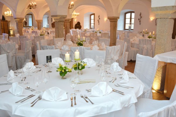 Der Hochzeitssaal im historischen Gutshofgewölbe kann ab 90 Personen genutzt werden und bietet Platz für rund 260 Personen. Die Dekoration der Tische kann von Ihnen selbst selbst oder falls gewünscht von uns bereitgestellt werden.